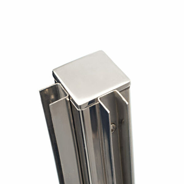 Pilar forma “U” de acero inoxidable para vidrio de 10/12 mm con 2 canales exteriores esquinero y placa al suelo.